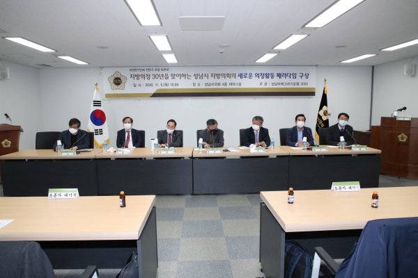 성남시의회 의원연구단체 ‘성남미래그리기포럼 2020(회장 조정식)’은 11. 5.(목) 오후 3시 성남시의회 4층 세미나실에서 ‘새로운 지방분권시대의 지방의회 위상과 역할 강화 방안’이란 주제로 토론회를 실시했다.이번 토론회는 지방의정 30년을 맞이하는 성남시의회의 새로운 의정활동 패러다임을 구상하기 위해 마련했다.