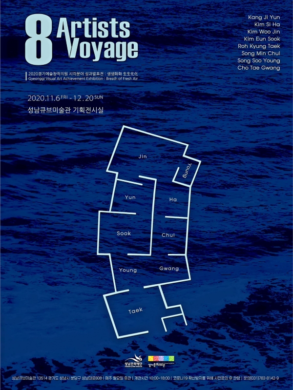 전시는 ‘8 Artists Voyage – 나를 찾아서 가는 길’을 주제로, 작가들을 배에 비유해 항구에 정박하고 있는 배들의 이야기가 아니라 거칠고 험난한 바다를 꿋꿋하게 항해 중인 배들의 현재진행형 이야기를 다룬다. 관람객들은 경계가 구분되지 않은 전시 공간에서 8명의 작가가 선보이는 예술적 항로와 예술가로서의 항해를 관찰자로서 참여하게 된다.