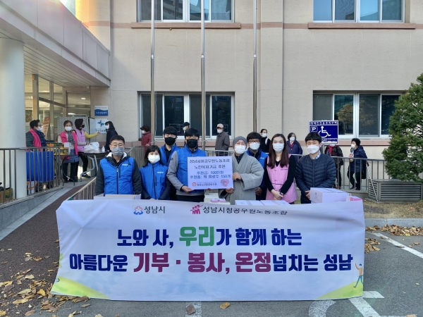 성남시청공무원노동조합은 “아름다운 기부·봉사, 온정 넘치는 성남“이라는 슬로건을 걸고 복지관 이용 어르신을 위한 노인복지기금 100만원과 후원품 떡과 두유 150개를 전달하였다.