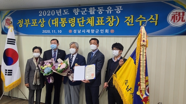 성남시재향군인회(회장 우건식)가 ‘2020년 전국 최우수 재향군인회’로 선정돼, 10일 성남시재향군인회관 지하 소회의실에서 「2020년도 향군활동 유공 정부포상(대통령 단체표창) 전수식」이 거행됐다.표창은 문재인 대통령을 대신해 김장훈 경기동부보훈지청장이 전수했다.