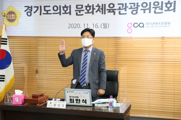 경기도의회 문화체육관광위원회 최만식 위원장(더불어민주당, 성남1) 은 16일 경기콘텐츠진흥원 본원에서 진행된 행정사무감사에서 신성장동력으로 주목받고 있는 신한류에 대한 진흥원의 사업 부재를 지적하고 이에 대한 향후계획에 대해 물었다.