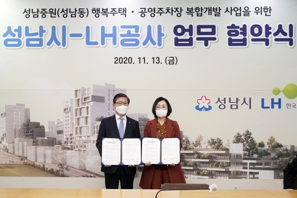 시는 11월 13일 은수미 성남시장과 변창흠 한국토지주택공사(LH) 사장, 윤영찬 국회의원, 지역구 시의원, 주민대표 등이 참석한 가운데 ‘성남중원 행복주택· 공영주차장 복합개발사업’ 추진을 위한 업무협약을 체결했다.