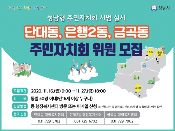 성남시는 단대동, 은행2동, 금곡동 3개 동 주민을 대상으로 16일부터 27일까지 주민자치회 위원 공개 모집에 나선다