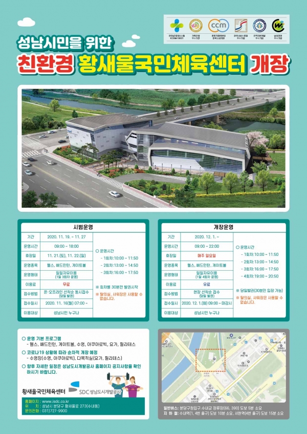성남도시개발공사(이하 공사)가 오는 19일부터 황새울국민체육센터(분당구 수내동 소재) 임시개장과 함께 무료체험 행사를 진행한다고 18일 밝혔다.