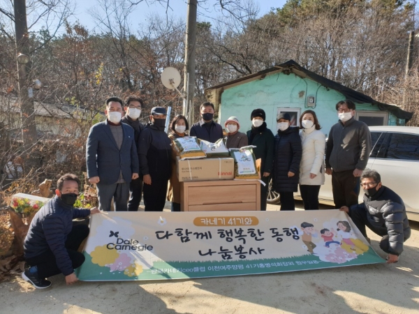 연말을 맞아 어려운 이웃에게 작게나마 희망과 사랑을 선물하자는 뜻을 모은 카네기 41기 회원들은 시 관련부서의 추천을 받아 여주와 이천 각 한 가구씩 대상자를 선정하였다. 선정된 가구에 실질적인 도움을 주기 위해 사전에 가구별 필요물품을 직접 확인하였다. 할머니와 초등학생이 함께 거주하는 집에는 학생이 갖고 싶어 했던 책상과 의자를, 홀로사시는 할머니 댁에는 가스렌지와 서랍장, 쌀 등을 전달하였다.