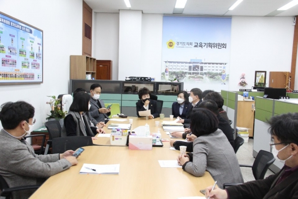 경기도의회 교육기획위원회 위원장 정윤경 의원(더불어민주당, 군포1)은 4일 교육기획위원회 협의실에서 황진희 부위원장(더불어민주당, 부천3)과 임채철 부위원장(더불어민주당, 성남5), 박덕동 의원(더불어민주당, 광주4), 김우석 의원(더불어민주당, 포천1)과 함께 성남 소재 중학교 전기안전사고 관련 사안에 대해 성남교육지원청과 경기도교육청 관련 부서와의 협의 시간을 가졌다.