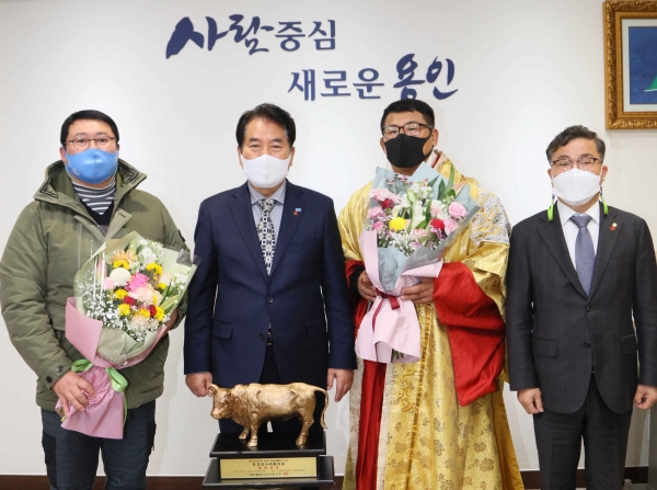 백군기 용인시장은 4일 시청 시장실에서 불혹의 나이를 극복하고 한라장사에 오른 우형원 선수 등 용인백옥씨름단과 시 씨름협회 관계자들을 격려했다.