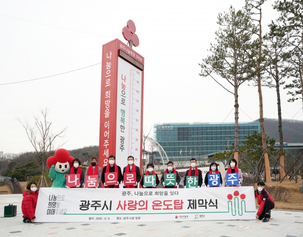 광주시는 9일 시청 광장에서 희망 2021 나눔으로 행복한 광주 나눔 캠페인의 시작을 알리는 ‘사랑의 온도탑’ 제막식을 개최했다.