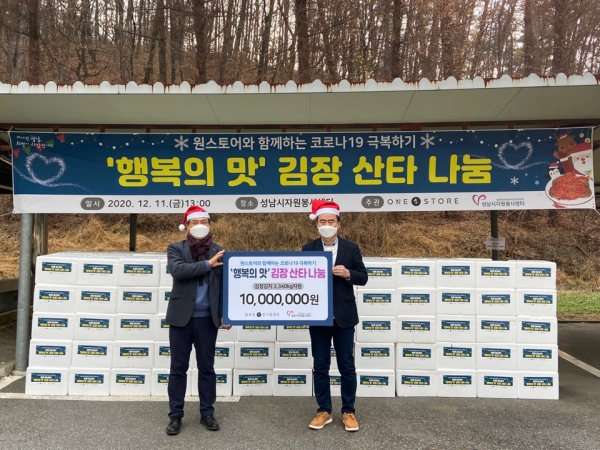 성남시자원봉사센터(센터장 이덕은) 를 통해 연말을 맞아 비대면 겨울나기 나눔이 전해졌다.12월 11일 2시 성남시자원봉사센터에서 취약계층에게 김장김치를 전하는 원스토어와 함께하는 코로나19 극복하기 ‘행복의 맛 김장 산타 나눔’ 전달식을 진행했다.