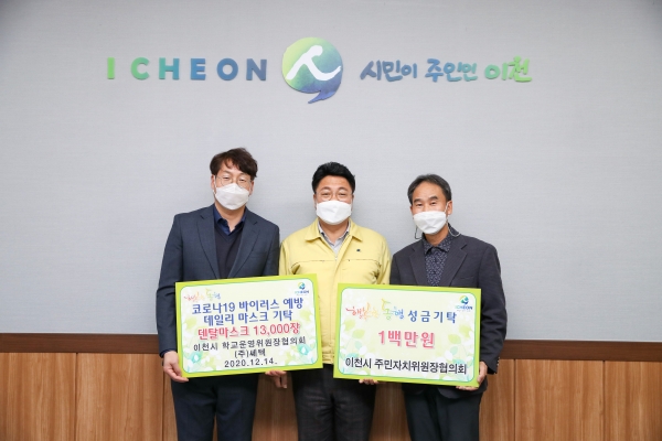 이어서 이천시 학교운영위원장협의회(회장 이기선)는 코로나19 위기 극복을 위한 덴탈마스크 13,000장을 이천시에 기탁했다.