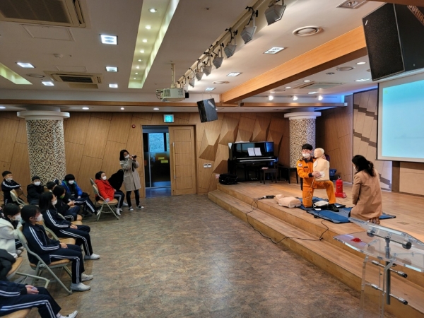 교육내용은 ▲화재예방을 위한 소방안전교육 ▲심폐소생술(CPR) 이론 및 실습 교육 ▲기초 응급처치 ▲119신고방법 ▲주택용 소방시설 홍보등으로 진행해 각종 상황 발생 시 대처할 수 있는 능력을 키우는 시간을 가졌다.