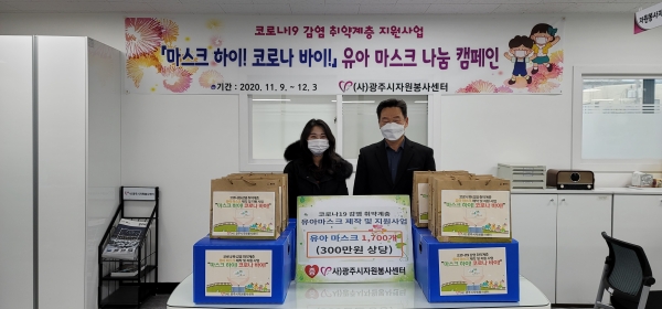 (사)광주시자원봉사센터(이사장 신동헌)는 지난 23일 유아 마스크 1,700장을 제작하여 관내 20여 곳의 병설 유치원과 초등학교, 자원봉사센터 등록 수요처 어린이집 7곳에 전달하였다.