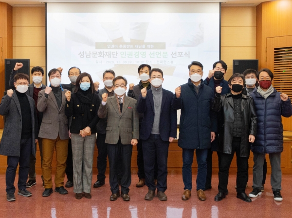 성남문화재단(대표이사 노재천)이 12월 30일(수), 성남아트센터 컨퍼런스홀에서 인권경영 선포식을 진행했다.인권경영이란 기관의 경영과정에서 인간의 존엄과 가치를 중시하고 보호하는 경영을 의미하며, 성남문화재단은 이번 인권경영 선포를 통해 인권존중을 바탕으로 사회적 가치실현 선도에 나선다.