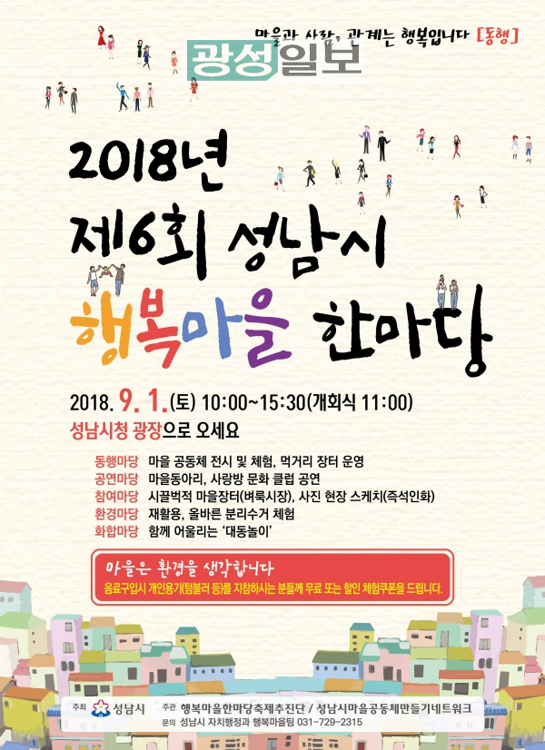 성남시(시장 은수미)는 오는 9월 1일 오전 10시~오후 3시 30분 시청 광장에서 시민 1000여 명이 참여한 가운데 ‘제6회 행복마을 한마당’ 행사를 연다.