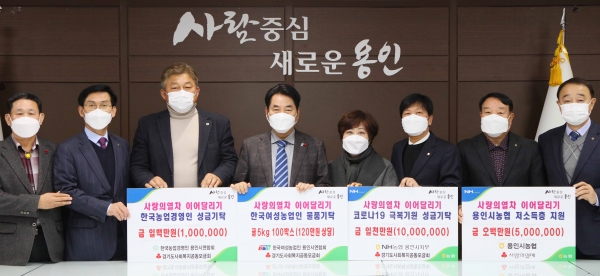 용인시 농협 10개 조합에서도 어려운 이웃을 위해 써 달라며 현금 500만원을 기부했다. 이기열 모현농협장은“추운 날씨와 코로나19로 더욱더 힘든 겨울을 보내고 있는 이웃들에게 도움이 되길 바란다”고 전했다.한국농업경영인 용인시연합회(연합회장 이주희)는 성금 100만원으로 온기를 더했다. 이주희 연합회장은 “작은 정성이지만 어려운 이웃들에게 작은 희망이 되길 바라는 마음을 모아 전달하게 됐다”고 밝혔다.