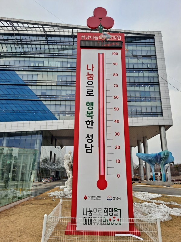 성남시는 시청 앞 광장에 설치한 ‘사랑의 온도탑’이 46일 만에 100도를 달했다.사랑의 온도탑은 경기사회복지공동모금회의 지원을 받아 지난 12월 1일 성남시청 앞 잔디광장에 설치되어 운영되어 왔으며, 1천1백만원이 기부가 될 때마다 1도씩 온도가 상승했다.