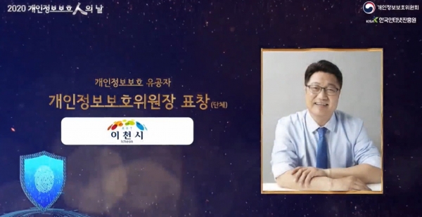 이천시(시장 엄태준)는 개인정보보호위원회(국무총리 직속)가 주최하고 한국인터넷진흥원에서 주관하는 ‘2020 개인정보보호人의 날’에서 개인정보보호 분야 개인정보보호위원회 기관 표창(장관급)을 받았다.
