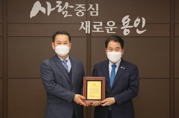 백군기 용인시장은 27일 시청 시장실에서 전통시장 활성화에 기여한 공로로 용인중앙시장 상인회로부터 감사패를 받았다고 밝혔다.코로나19 위기로 시장을 찾는 시민 발길이 줄어 어려움이 큰 가운데 시가 시장에 활력을 불어넣기 위해 다양한 노력을 기울인 데 대한 감사의 뜻에서다.
