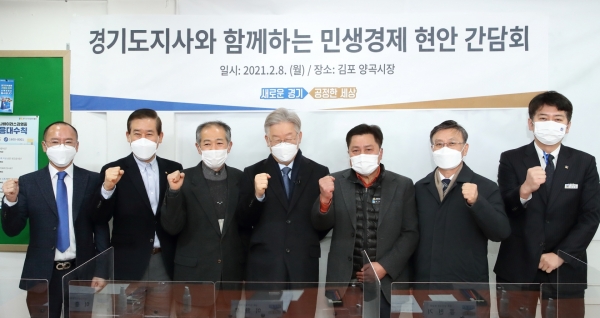 이재명 지사는 이날 정하영 김포시장, 이충환 경기도상인연합회장, 이환우 양곡시장 상인회장, 이홍우 경기도시장상권진흥원장 등과 ‘민생경제 현안 간담회’를 갖고 이 같이 밝혔다.