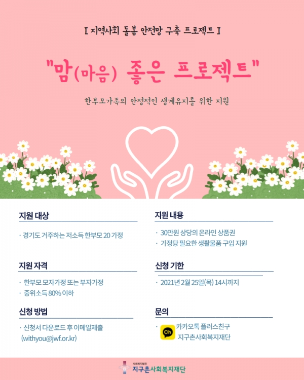 사회복지법인 지구촌사회복지재단(대표이사 최성은)은 다가오는 봄을 맞이하여 경기도 내 저소득 한부모 가정에 생활용품 구입을 지원하는 “맘(마음) 좋은 프로젝트”를 진행한다.