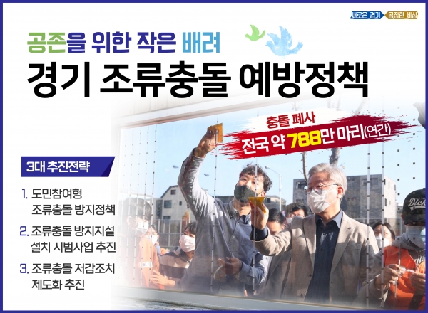 또 자연생태를 직접 관찰‧기록‧공유하는 온라인 기반 자연활동 공유 플랫폼 ‘네이처링’에 따르면, 최근 2년간 경기도에서 4,168마리의 조류충돌이 발견됐다. 이는 전국 합계 1만5,892건의 26%에 해당하는 수치로 전국에서 가장 많다.도는 야생 조류 충돌사고 예방을 위해 지난해 11월부터 4개 실‧국 10개 팀이 참여하는 전담조직(T/F)을 구성했으며 ‘작은 배려로 사람과 동물이 공존 가능한 경기도’라는 비전 아래 ‘3대 추진전략’을 수립했다.추진 전략을 살펴보면 도는 먼저 도민이 직접 참여하고 공감하는 조류충돌 방지 정책을 추진한다.