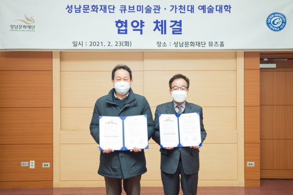이번 협약을 통해 성남문화재단과 가천대학교 예술대학은 사업 공동기획 및 추진, 홍보 등을 함께하고 특히 성남큐브미술관을 활용해 성남 청년예술가 전시 활동 지원에 나서기로 했다. 2020년 12월 청년예술가 참여전시 ‘우리는 같은 꿈을 꾼다’ 공동 진행에 이어 2021년 하반기에도 공동 진행을 준비한다.