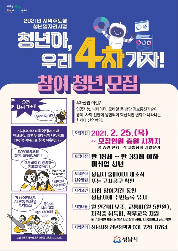 성남시(시장 은수미)는 2월 25일부터 지역주도형 일자리사업의 일환인‘청년아, 우리 4차가자!’를 통해 취업할 청년 25명을 모집한다.