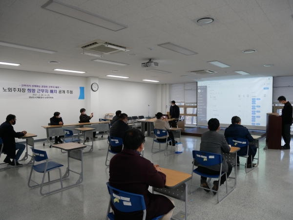 성남도시개발공사(사장 윤정수, 이하 공사)가 지난 26일 모란다목적 공영주차장에서 노외주차장 주차관리원 대상 근무지 배치 추첨을 실시했다.
