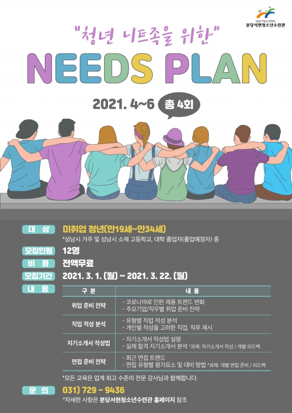 성남시청소년재단(대표이사 진미석) 분당서현청소년수련관은 청년 지원 프로젝트의 일환으로 취업 준비생들을 위한 [청년 니트(NEET: 고용, 교육 혹은 훈련을 받지않은 청년)족을 위한 Needs Plan]의 참가자를 3월 22일까지 모집한다.