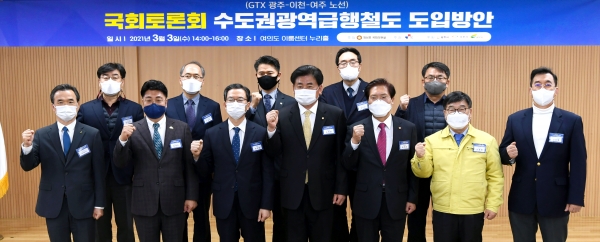 경기도 동남부지역 수도권광역급행철도(GTX) 유치를 위한 토론회가 3일 여의도 이룸센터 누리홀에서 개최됐다.이날 열린 ‘수도권광역급행철도 도입 방안 국회 토론회’에는 정성호 국회 예결위원장과 소병훈 국회의원(경기 광주 갑), 신동헌 광주시장, 엄태준 이천시장, 이항진 여주시장 등이 참석했다.