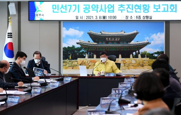 광주시는 8일 시청 상황실에서 ‘민선7기 공약사업 추진현황 보고회’를 개최했다.이날 보고회에는 신동헌 시장을 비롯해 간부공무원 등 30여명이 참석했으며 공약사항의 세부추진 사항을 점검하고 각종 문제점과 대책을 논의해 시민과의 약속이행과 신뢰행정을 도모하기 위해 마련됐다.