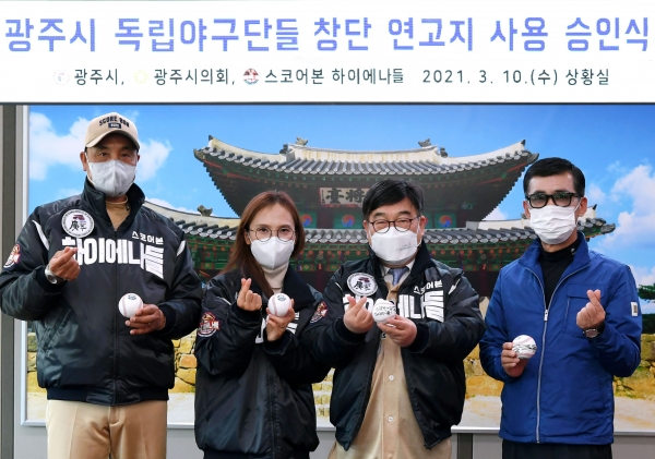 광주시는 10일 시청 상황실에서 ‘광주시 독립야구단 연고지 사용 승인식’을 개최했다.이날 승인식에는 신동헌 광주시장과 임일혁 시의회 의장, 이은희 독립야구단 구단주, 송진우 감독이 참석했다.