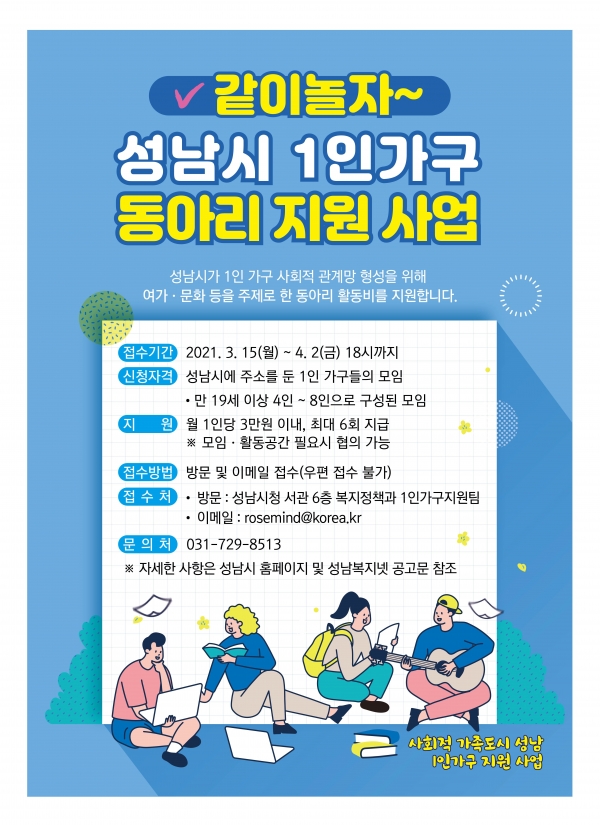 지원받으려면 성남시 홈페이지(공고)에 있는 신청서와 성남시 1인 가구 동아리 사업계획서, 개인정보제공 및 활용 동의서 등의 서류를 기한 내 시청 6층 복지정책과에 직접 내거나 담당자 이메일(rosemind@korea.kr)로 보내면 된다.