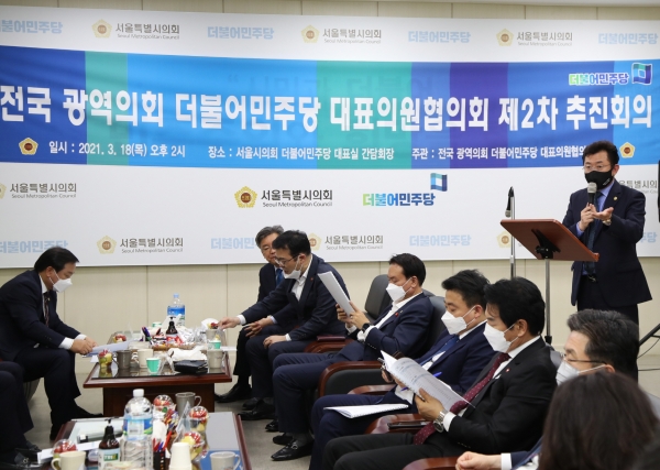 전국 광역의회교섭단체 더불어민주당 대표의원협의회(회장 박근철, 이하 ‘광역의회교섭단체협의회’)는 광역의회 더불어민주당 대표의원들이 모인 가운데 18일(목) 서울시의회에서 2차 추진회의를 개최했다.