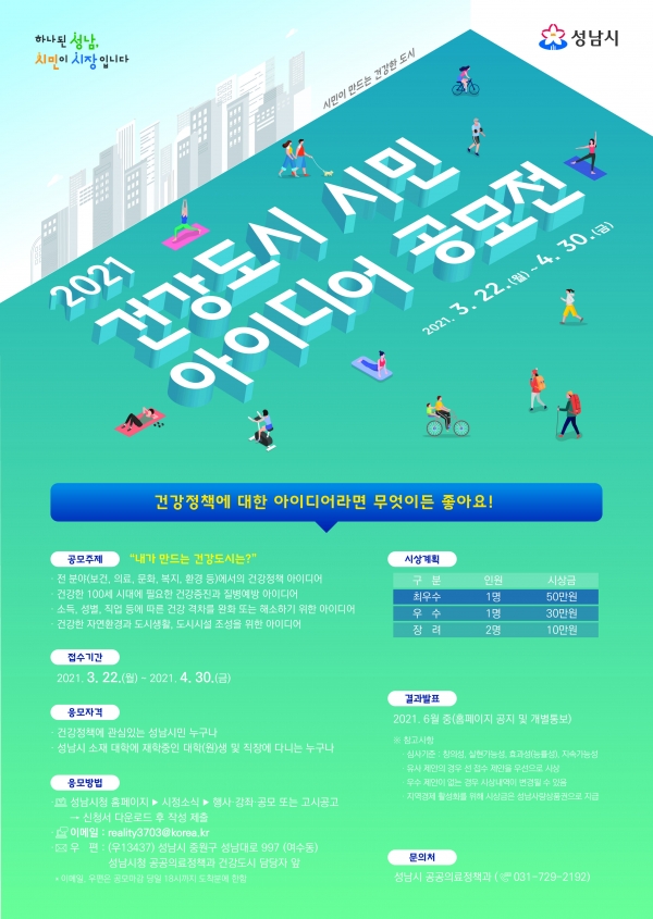 성남시(시장 은수미)는 오는 3월 22일부터 4월 30일까지 건강 도시 조성에 관한 시민 아이디어를 공모한다.