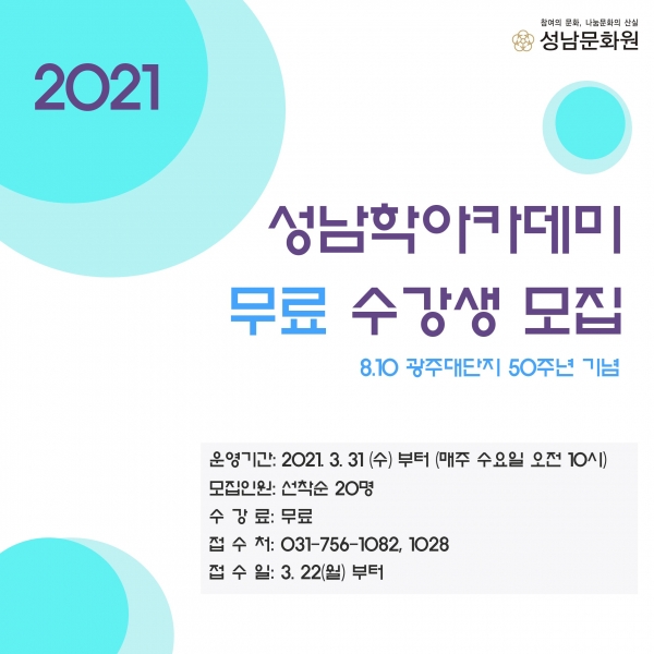 성남문화원 ‘2021년 성남학아카데미’는 광주대단지사건 50주년을 맞이하면서 역사와 인문학을 통해 시민의 삶의 질을 높이고자 하며, 우리 고장을 더욱 사랑하는 계기를 마련하고자 3월 31일부터 매주 수요일 오전10시 문화원에서 진행된다.