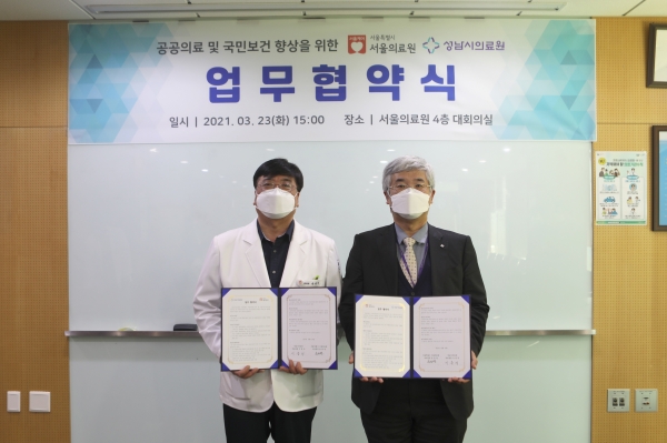 성남시의료원은 서울의료원과 23일 서울의료원 대회의실에서 ‘공공의료 및 의학의 발전, 국민 보건 향상에 기여하기 위한 업무협약(MOU)‘을 체결하였다.이 협약식에는 성남시의료원 이중의 의료원장과 서울의료원 송관영 의료원장 등 주요 관계자가 참석한 가운데 진행됐다.