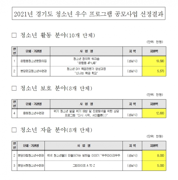 이번 공모에 선정된 프로그램은 △은행동청소년문화의집 청소년 창의력 워크숍 "은행동 4P-LAB”, △분당판교청소년수련관 청소년 DIY 목공전문가 양성과정 "신나는 목공 학교”, △중원청소년수련관 위기 청소년 발굴 위기 예방 및 진로탐색을 위한 상담 "다시 시작, 세미콜론(;)”, △분당야탑청소년수련관 백색 청소년들이 만들어가는 밤하늘 이야기 "우주라이크우주”, △분당서현청소년수련관 “그린라이프 A TO Z”이다.