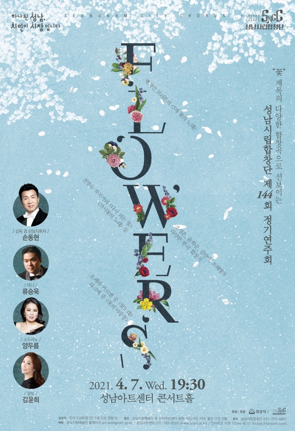 성남시립합창단에서는 오는 4월 7일(수) 오후 7시30분 성남아트센터 콘서트홀에서 ‘Flowers!’라는 타이틀로 제144회 정기연주회를 개최한다. 새봄을 맞이하여 봄의 정취를 물씬 느낄 수 있는 꽃과 봄을 주제로 한 다양한 합창곡으로 마련된다.