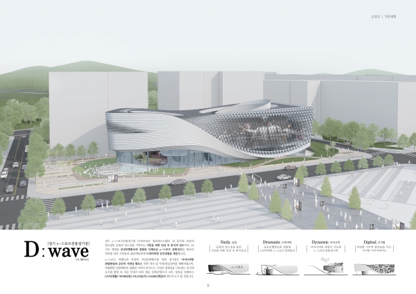 성남시(시장 은수미)가 전국 최초로 ‘e-스포츠 전용 경기장’을 신축하기 위한 설계안이 나왔다.시는 설계작 공모 기간(2020.12.11~3.8)에 응모한 7개 업체의 설계작 중에서 다양한 행사 공간 구성, 정체성, 상징성 등에서 가장 높은 종합점수를 얻은 ㈜디엔비파트너스 건축사 사무소의 설계작 ‘D:wave(디:웨이브)’를 당선작으로 선정했다고 31일 밝혔다.
