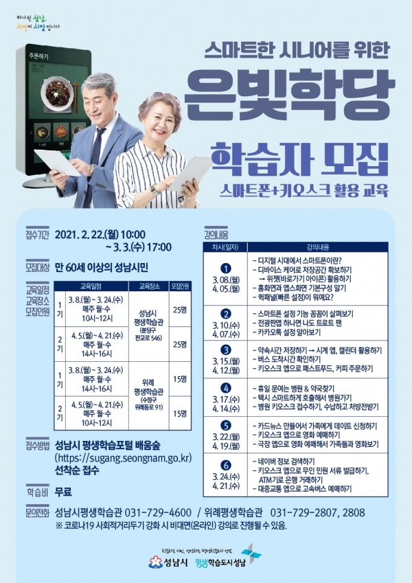 성남시(시장 은수미)는 만 60세 이상 노년층을 대상으로 야탑과 최근 개관한 위례 평생학습관에 ‘은빛학당’을 개설한다. 이 ‘은빛학당’ 첫 프로그램으로 스마트폰과 키오스크 활용 교육을 제공한다.