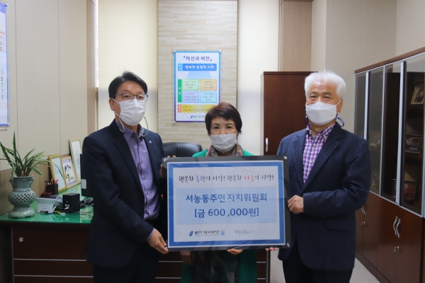 용인시 기흥구 서농동은 주민자치위원회가 관내 복지시설을 위해 90만 원을 기탁했다고 6일 밝혔다.이날 서농동 주민자치위원회가 기탁한 성금은 지난달 22일부터 위원회가 개최하고 있는 사랑나눔 알뜰장터의 수익금 중 일부로 기흥노인복지관과 기흥장애인복지관에 각 60만 원과 30만 원을 전달했다.