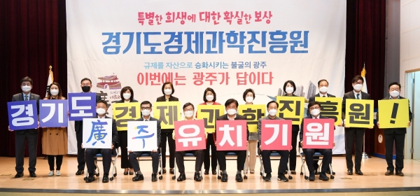 경기도가 경기도경제과학진흥원과 경기농수산진흥원 등 7개 공공기관 이전을 추진하고 있는 가운데 광주시는 7일 ‘40만 광주시민과 함께하는 경기도경제과학진흥원(경과원) 유치 염원 범시민 결의 대회’를 개최했다.