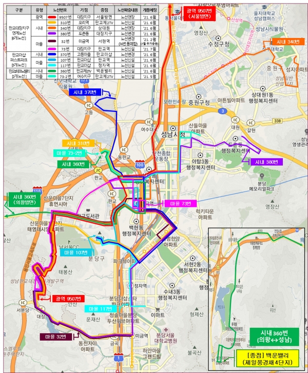 이중 광역버스(9507번)는 서울시, 경기도와 협의를 통해 성남 대장동부터 서울 강남역 방면으로 운행을 추진한다. 이와 함께 시는 대장동에서 서울역 방면 광역버스 추가 노선 확충을 위해 경기도의 공공버스 신규노선 공모에 신청서를 낸 상태다.