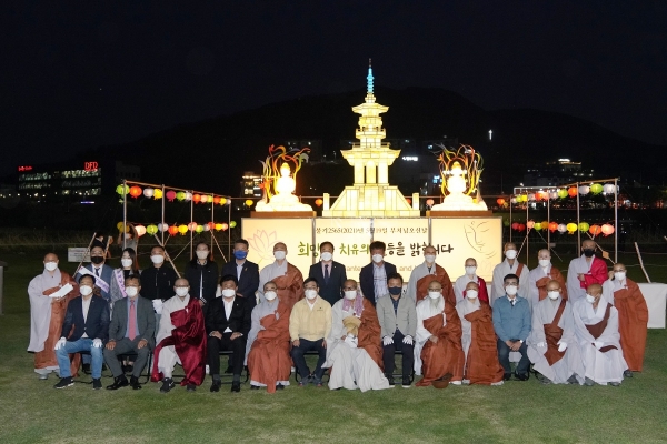 광주시는 지난 22일 청석공원 잔디광장에서 불기 2565년 부처님 오신 날을 맞아 봉축탑 점등식을 봉행했다.