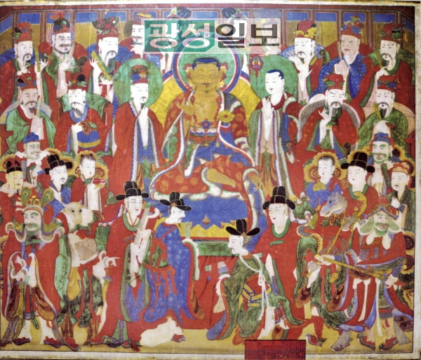 가운데 대좌에 지장보살이 앉아있고, 왼쪽엔 무독귀왕, 오른쪽엔 도명존자가 합장한 채 서 있다. 그 주위에 시왕(十王), 판관, 동자, 천녀, 장군, 옥졸 등이 배치된 구도다.