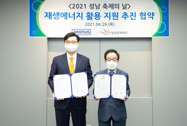 재단은 29일(목) 성남아트센터에서 재생에너지 전문 스타트업 이온어스(대표이사 허은)와 ‘탄소중립 그린발전 지원 업무협약’을 체결하고, 올해 10월 예정된 ‘2021 성남 축제의 날’을 친환경 축제로 운영하기 위한 재생에너지 활용 지원 협력을 약속했다.