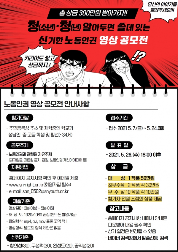 성남시청소년재단(대표이사 진미석)은 5월7일부터 24일까지 청소년-청년 노동인권 영상 공모전을 개최한다.