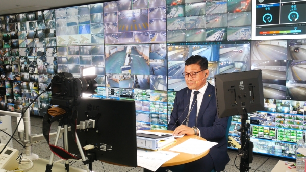 [2020년도 지방공기업 혁신우수사례 경진대회(주최: 지방공기업평가원)에서 SDC중앙관제센터를 소개하는 윤정수 사장]