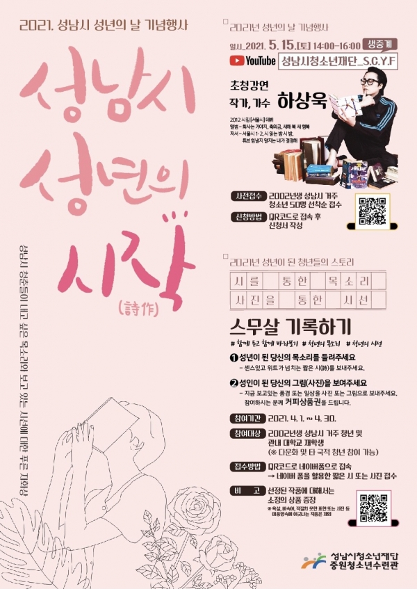 이번 기념행사는 ▲성남시는 통화중(通和中) ▲성남시만 알고 있다 ▲ 새로움에 소리치다 등 청년이 참여하는 다양한 온라인 콘텐츠와 ▲청년세대에게 각광받는 하상욱 작가의 강연을 유튜브를 통해 실시간으로 중계할 예정이다.